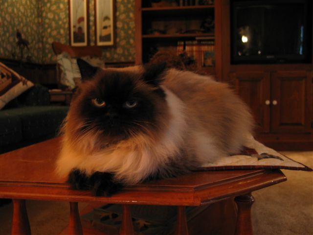 will be 14 years old this December. Pictured with Softtail (chocolate) and our other Siamese is Dyna, all named after